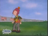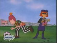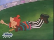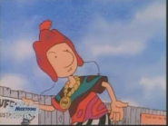 He is later seen wearing a trapper beanie hat, a golden necklace, and a hippie shirt over referee hockey pants and brown shoes and kicking a soccer ball at the poster of Dylan Farnum mounted on the fence out of pique. Judy comes around and tells him that his look is derived from the "Scizola" from the magazine cover, much to Doug's annoyance. Judy also tells him that he shouldn't care if he was copying someone or not.